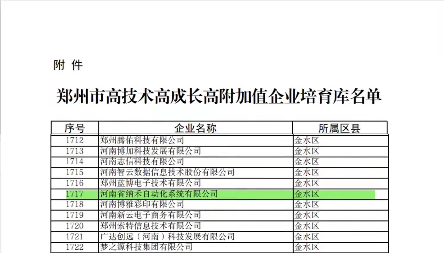 為(wéi)貫徹落實《鄭州市人民(mín)政府辦公廳關於支持(chí)高技術高(gāo)成長高(gāo)附加值企業高質量發展的實施意見》(鄭政辦〔2021〕59號),按照《鄭州(zhōu)市工業和信(xìn)息化局 鄭州市科學技術局 鄭州市發展和改革委員會關於開展高技術(shù)高成長高附加值(zhí)企業培育庫申報(bào)工作的通知》(鄭工信運行〔2021〕16號)要求,河南省日本熟WWW自動化係統有限公司被納入鄭州市高技術高成長高附加值企業培育(yù)庫。