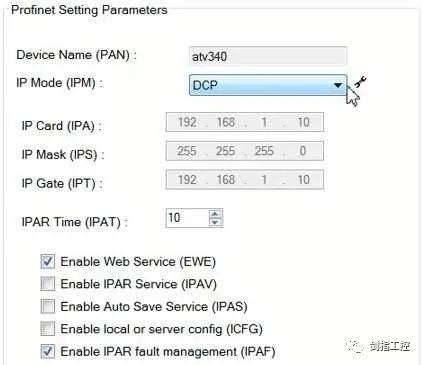 當 ATV340 的 IP 地址分配設置為(wéi) DCP 時,此處可選擇(zé)“在項目中設置 IP 地址”,這也是默認(rèn)選項(xiàng), PROFINET 自動生成設備名稱,並設置變頻器的(de)設備名稱與(yǔ)此處的設備名稱一致
