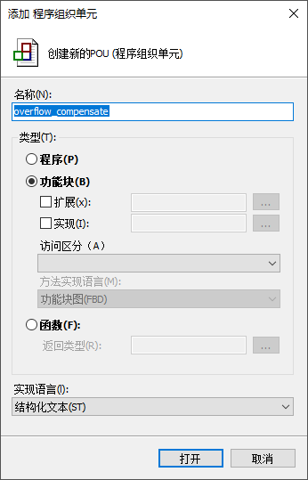 創(chuàng)建名稱(chēng)為【overflow_compensate】的FB多(duō)圈位置(zhì)溢出補償功能塊,ST編程語言(yán),如圖4所示。